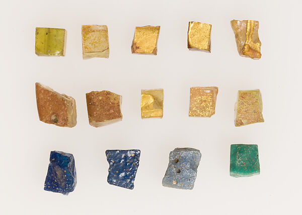 - Dimensions: Various sizes-largest tessera: 3/8 x 1/4 x 3/16 in. (1 x 0.7 x 0.5 cm)