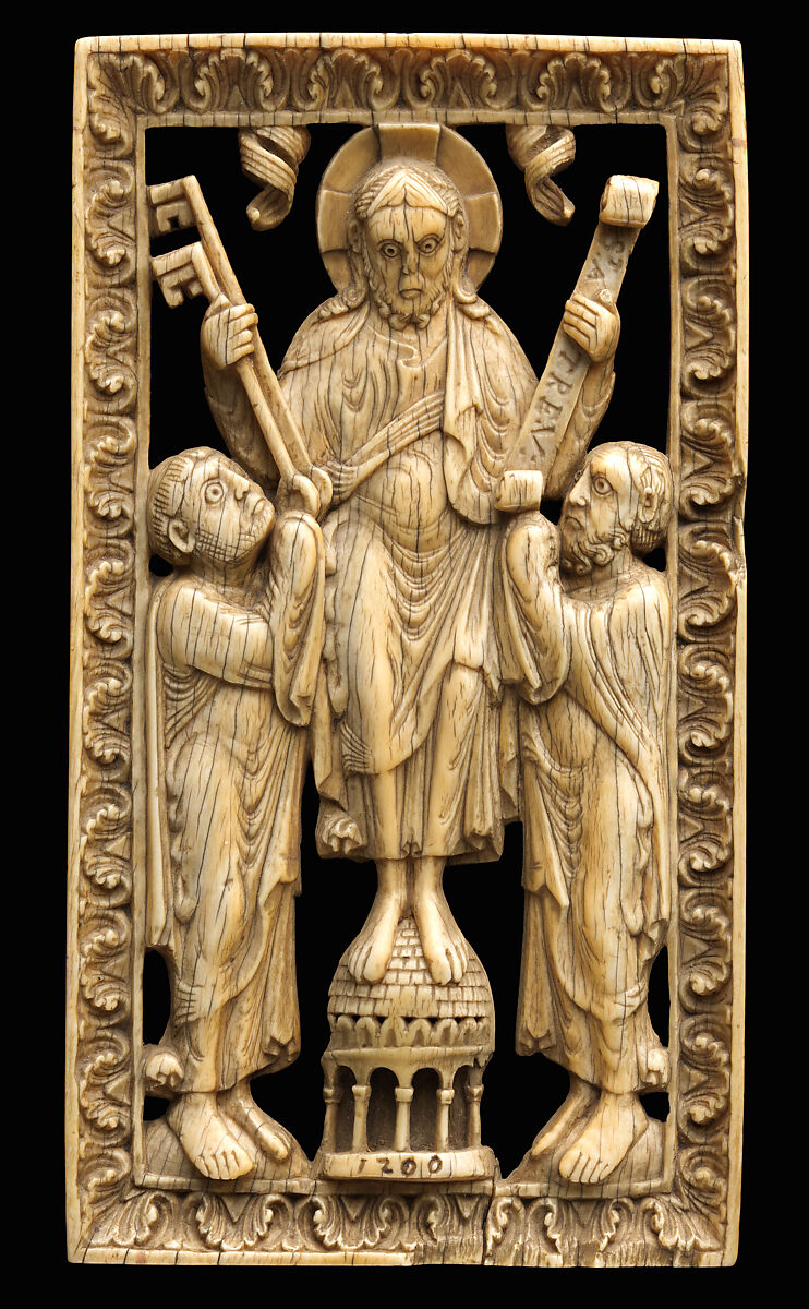The theme of Christ handing the keys of heaven to Saint Peter and the law to Saint Paul, which originated in fourth-century Rome, refers to the Gospel of Matthew (16:18): "I also tell you that you are Peter and on this rock I will build my church." At the same time, it highlights the importance of Saint Paul’s mission to the Gentiles. In this powerful interpretation, a domed structure, perhaps representing the heavenly Jerusalem, replaces the rock on which Christ is depicted more frequently. The dramatic expressions, the fluid clinging drapery, and the openwork carving are characteristic of German Romanesque ivory carving. The inscription, including the date 1200, is of later origin.