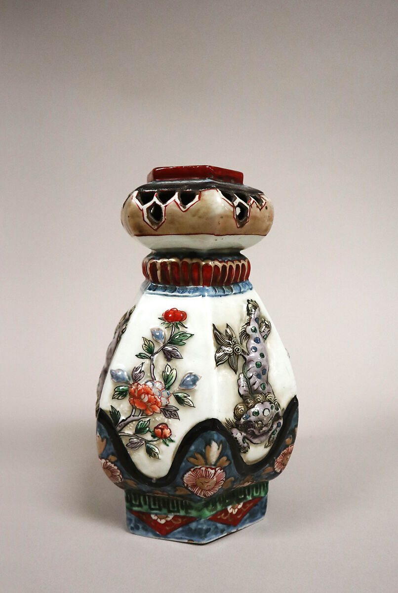 - Medium: White porcelain with slip relief; decorated with blue under the glaze, polychrome enamels (Arita ware)