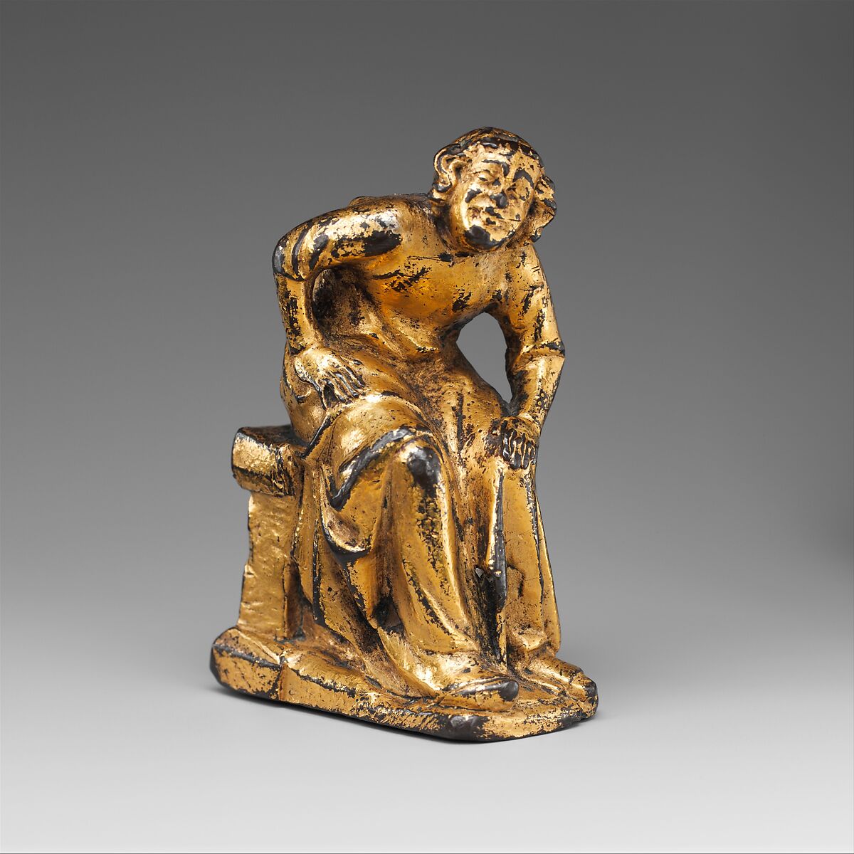 The pose of this statuette of a cleric of friar, echoing ancient figures of Atlas, and the indentation cast into its back tell us that it was originally intended as a support for a larger object. Like the carved pair of altar angels in The Cloister's collection (acc. nos. 52.33.1, .2), the style of this cast figure derives ultimately from the seminal sculpture of thirteenth-century Reims Cathedral—in this case from the console figures on the west facade and nave exterior. No thirteenth-century shrine survives intact with support figures like this one, but there are examples from the later Middle Ages. Furthermore, a number of the scenes depicted in the Hours of Jeanne d'Evreux (acc. no. 54.1.2) are set in architectural frameworks supported by similar bent figures.