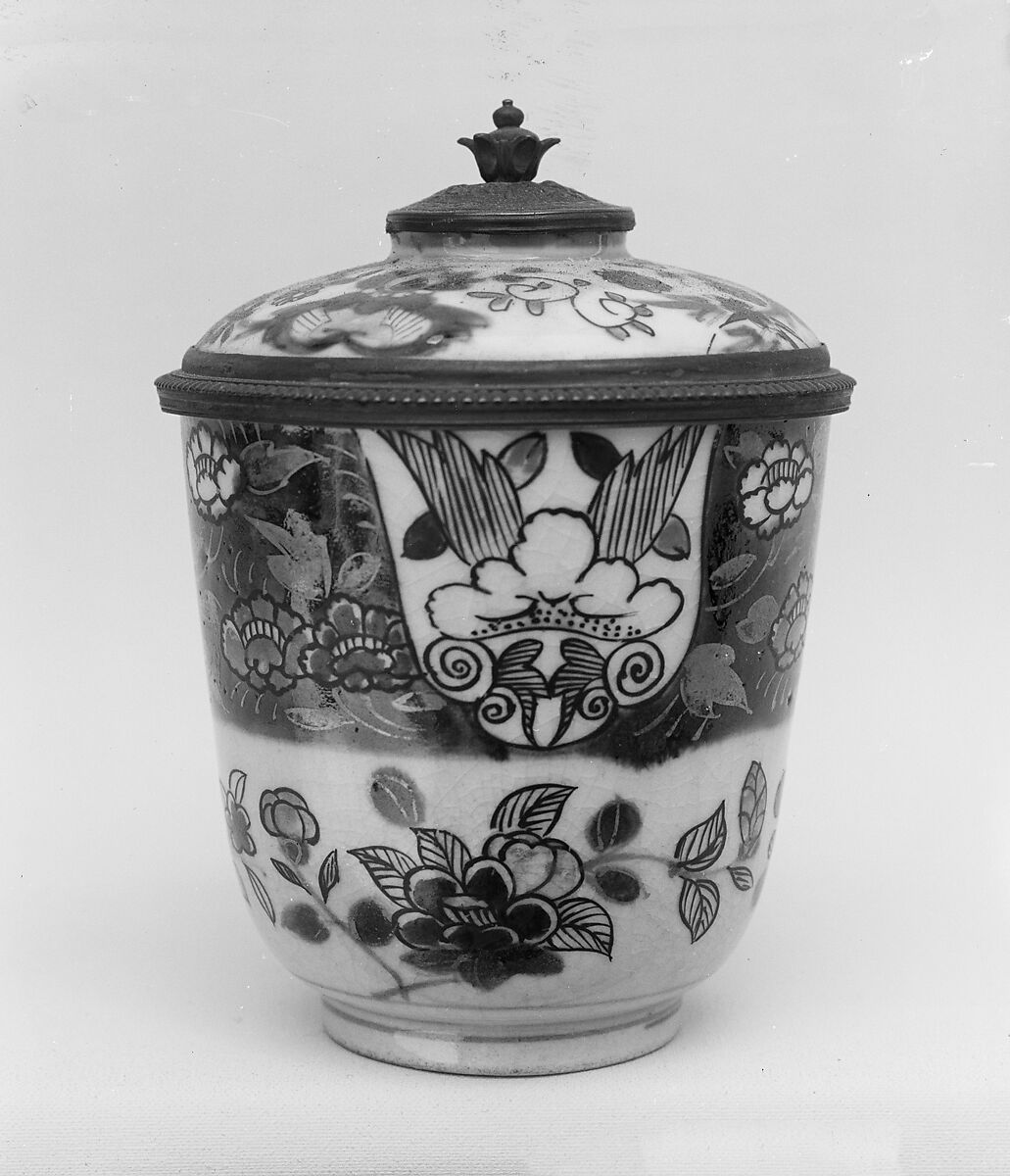 - Medium: White, crackled porcelain cup decorated with blue under the glaze, iron red and gold; the cover of white porcelain, similarly decorated