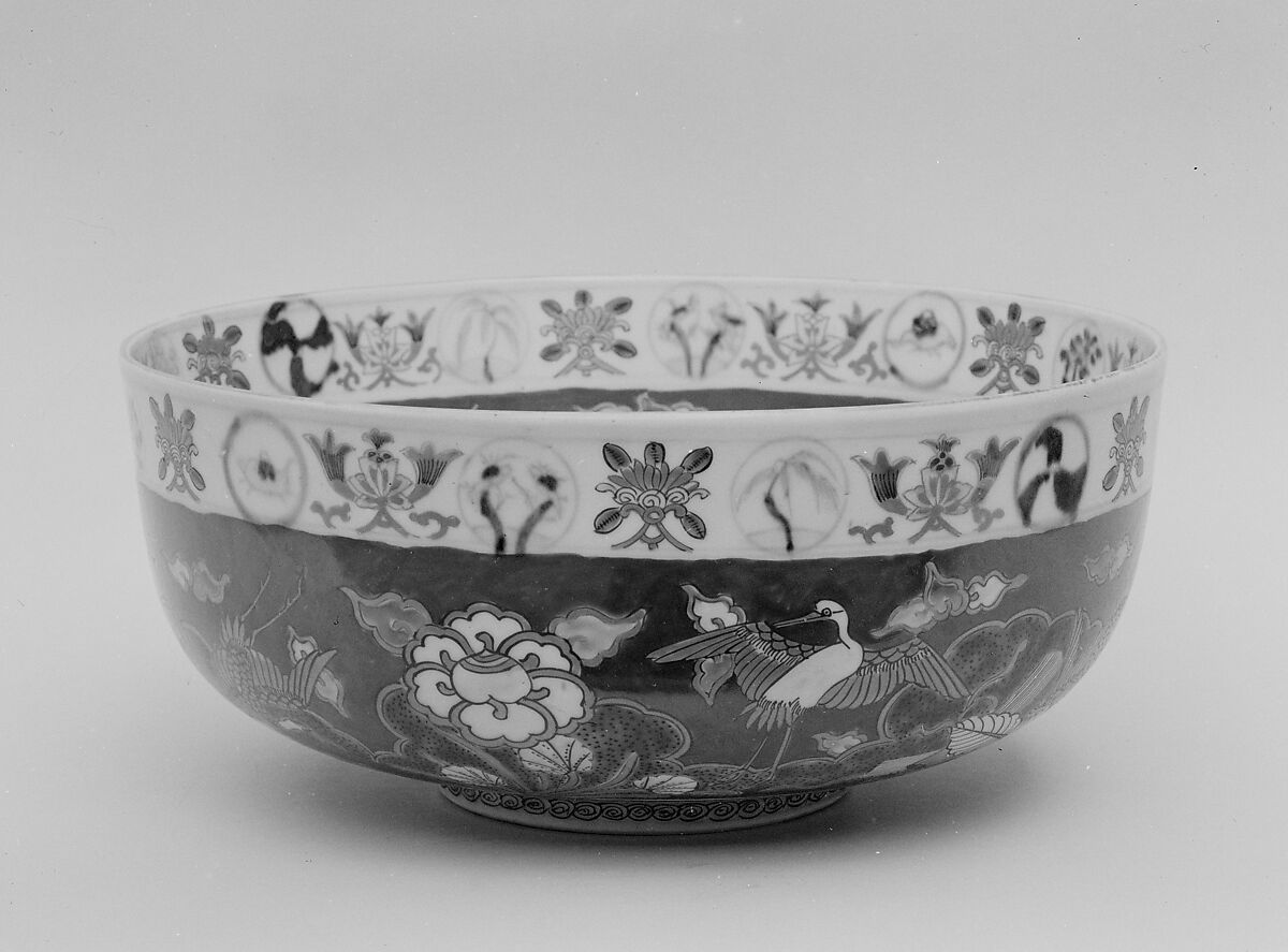 - Medium: Porcelain decorated in blue, green, red-orange and gilt (Arita ware, Imari style)