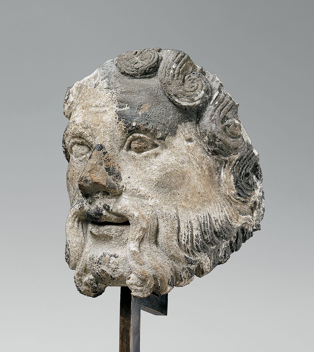 This finely carved head comes from the lintel of the north transept portal (Porte des Valois) of the abbey church, which depicted the martyrdom of Saint Denis, France's patron saint. Although the portal was carved 1160-70, it was erected in its present location in the thirteenth century. Parts of it were damaged in the wake of the French Revolution. The close stylistic resemblance to the column figure from the cloister (displayed nearby) suggests that both were products of the same workshop.