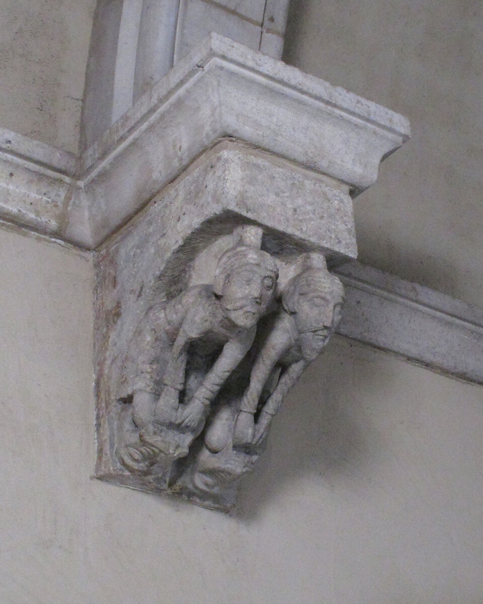Mischief and humor abound on the ten architectural supports set around the perimeter of this gallery. Naked grimacing acrobats wrestle and pull violently at each others’ beards; a snarling beast proudly claims a bone. Similar mischievous, and sometimes mystifying, motifs are often found on corbels set just under the eaves of the roof on the outside of a church.