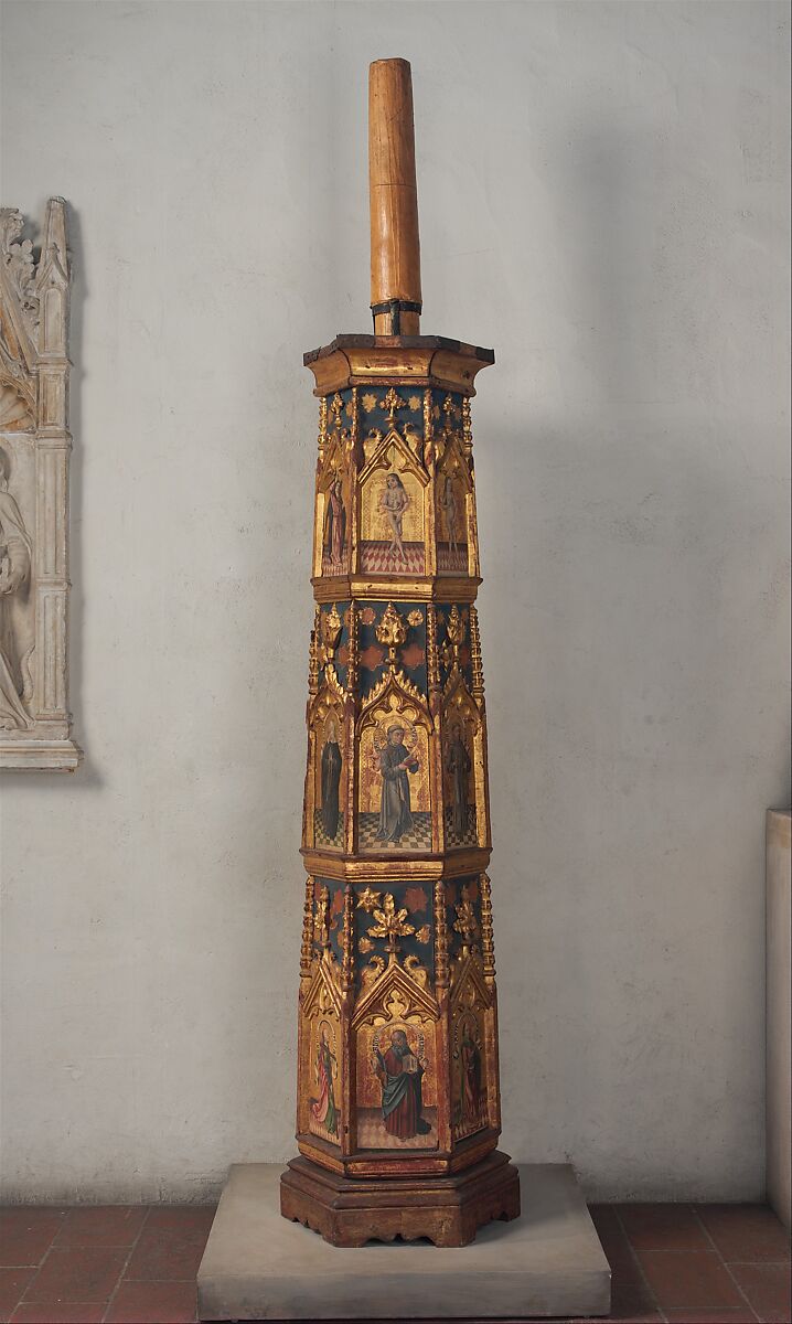 Paschal candlesticks figure prominently in the liturgy of the Easter vigil as part of the celebration of the Resurrection. In a practice that dates to the early church, the congregation gathers around the candlestick while the deacon inserts grains of incense into five holes in the wax of the candle arranged in a cruciform pattern. The ceremony, known as Lumen Christi, concludes with the lighting of the paschal candle, which is raised above the congregants—in the case of this example, more than six feet above them. The decoration of the hexagonal candlestick is organized in three tiers. The upper register is devoted to the Old Testament: Adam and Eve, the Expulsion of Adam and Eve (depicted on two faces), and the prophets Jeremiah, Ezekiel, and Zachariah. The second register depicts Saint Benedict and five Franciscan saints: Francis, Bernardino, Anthony of Padua, Louis of Toulouse, and Clare. Six of the apostles appear at the bottom: Saints Bartholomew, Thomas, Barnabas, John, Philip, and Matthias.