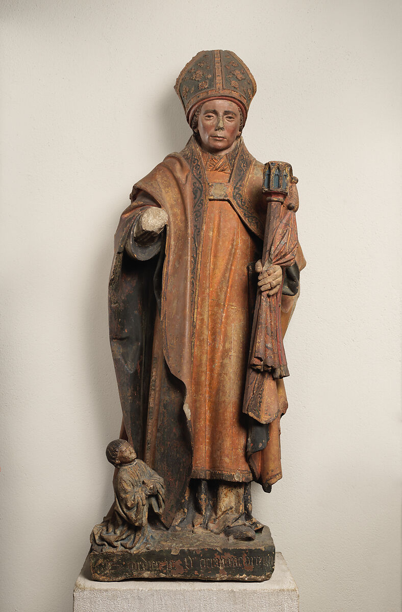 Wearing a miter on his head and holding a crozier in one hand, this commanding figure represents a bishop. He is identified in the inscription on the base as "Germain," either the bishop of Paris or, perhaps more likely, given the Burgundian style of the carving, of Auxerre. The tiny churchman kneeling at his feet is identified as "H. Cordier" in the inscription, but nothing is known of his life apart from the donation of this imposing sculpture.