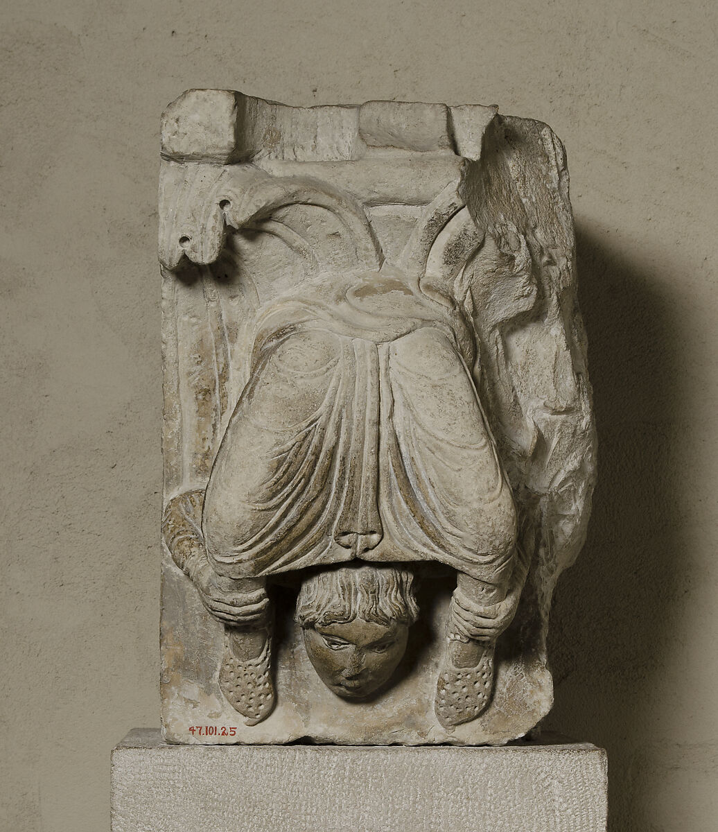 Acrobats appear often in medieval art, offering amusing reminders of the world beyond church or monastery walls. Appearing to defy the rules of nature, this contorted figure distracts attention from the capital’s function as an architectural support. Saint-Martin at Savigny was a thriving abbey in the Middle Ages, with numerous dependencies. It was damaged during the Reformation, and its community diminished in size and was ultimately disbanded in 1779. In the wake of the French Revolution that began a decade later, most of the buildings were destroyed and the sculptures dispersed.