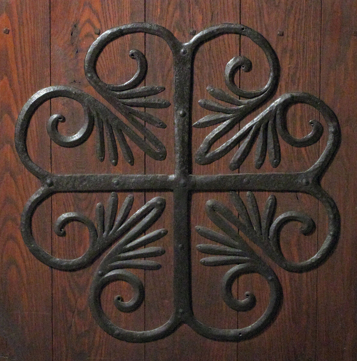 Their utilitarian function notwithstanding, medieval door mounts are often ornately designed, with geometric and fanciful motifs. Here, the beasts resemble panthers, which according to medieval bestiaries, exuded a sweet-smelling breath that attracted animals upon which they preyed. The church dedicated to Saint Leonard of Noblat near Limoges was frequented by pilgrims who believed that the saint was particularly efficacious in liberating prisoners.