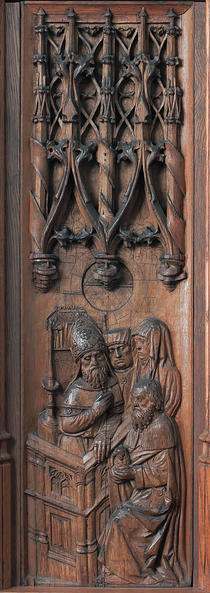 Carved on The Cloisters' thirty-five oak panels are scenes from the lives of the Virgin and Christ, each set under an elaborate canopy of single or double arches. The exuberant latticework surrounding the arches provides an almost encyclopedic display of pinnacles, crockets, spirals and other fanciful decorations. The panels show here open the narrative sequence, with the childless Joachim and Anne standing inside the Temple, saddened by the refusal of their offering. On the next panel an angel, arching his body, appears to Joachim with the news that he and Anne will have a daughter and that she will be named Mary. As in many late medieval works, the figures are foreshortened within their inhabited surroundings, adding depth and drama to the composition.