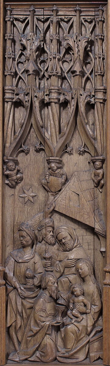 Carved on The Cloisters' thirty-five oak panels (50.147.1–38) are scenes from the lives of the Virgin and Christ, each set under an elaborate canopy of single or double arches. The exuberant latticework surrounding the arches provides an almost encyclopedic display of pinnacles, crockets, spirals and other fanciful decorations. As in many late medieval works, the figures are foreshortened within their inhabited surroundings, adding depth and drama to the composition.