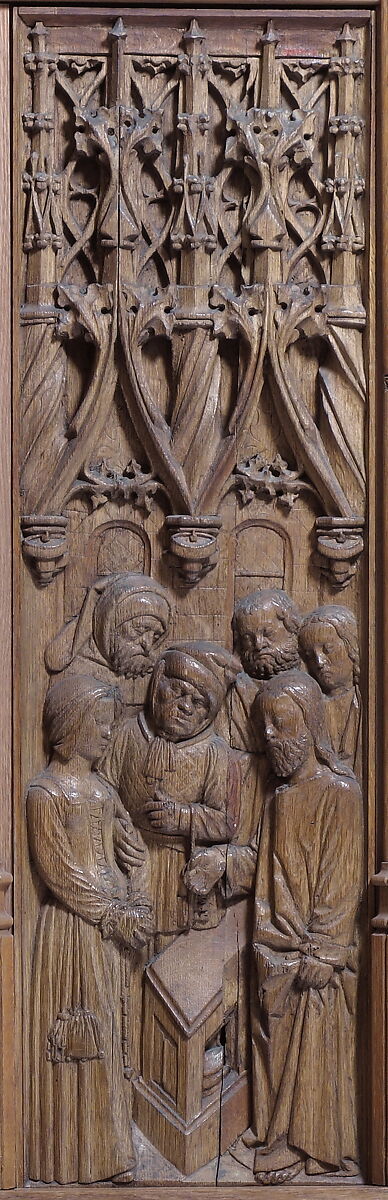Carved on The Cloisters' thirty-five oak panels (50.147.1–38) are scenes from the lives of the Virgin and Christ, each set under an elaborate canopy of single or double arches. The exuberant latticework surrounding the arches provides an almost encyclopedic display of pinnacles, crockets, spirals and other fanciful decorations. As in many late medieval works, the figures are foreshortened within their inhabited surroundings, adding depth and drama to the composition.
