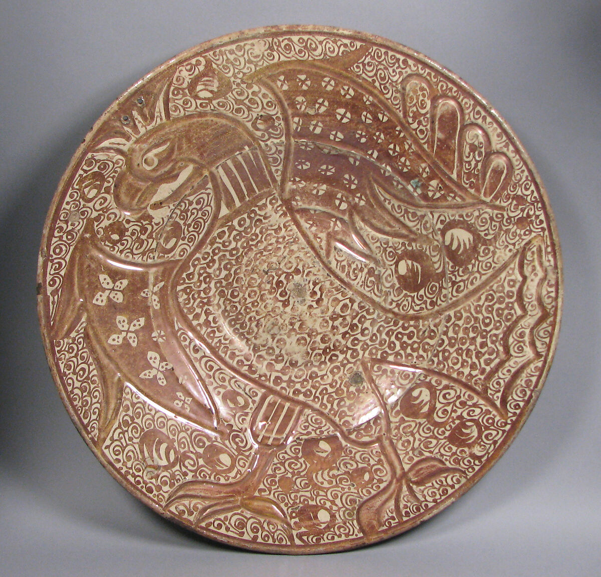 Beginning in the late fifteenth and early sixteenth centuries, the famed lusterware potters of Manises, near Valencia, experimented with new compositions and designs that included incised reliefs of large animals and fantastic creatures spanning the surface of entire dishes such as this one. The artist would use either a stencil or draw freehand and fill in the space around the figure with smaller decorative elements. Here, the artist experimented with wheel-like shapes and four-petaled flowers on the wings, a network of interlinked circles on the body, and swirling plants in the background. Many of the plates that follow this general design are completed in a coppery finish which is created by an absence of silver in the pigment. On the reverse, large fern fronds dominate the surface.