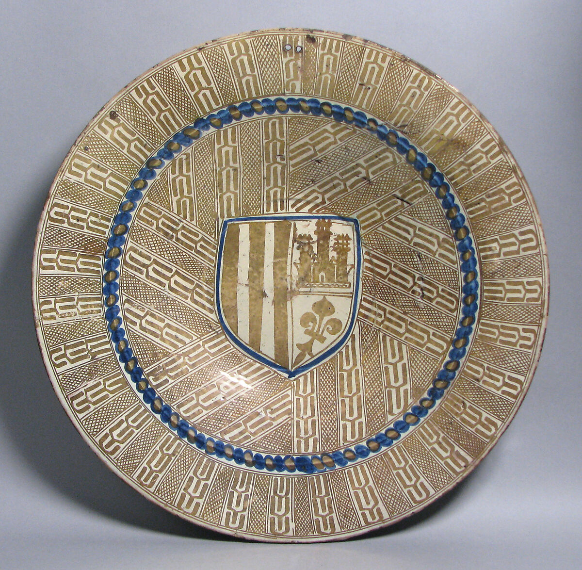 Knowledge of the technique for creating lusterware made its way to the Iberian Peninsula by the twelfth century, when most of the region was still under Islamic rule. By the 1400s, the Iberian center of lusterware production was in Manises, near the city of Valencia. Previously a Muslim taifa, or principality, the Kingdom of Valencia was conquered in the thirteenth century by James I for the Crown of Aragon, and it was here that Christians and Muslim potters worked, sometimes together, for a diverse clientele with a voracious appetite for high quality lustered wares.