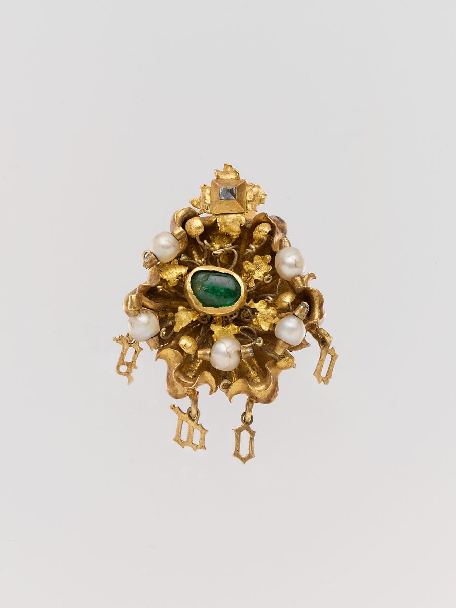 • Medium: Gold, pearls, diamond, emerald paste, and silver pin