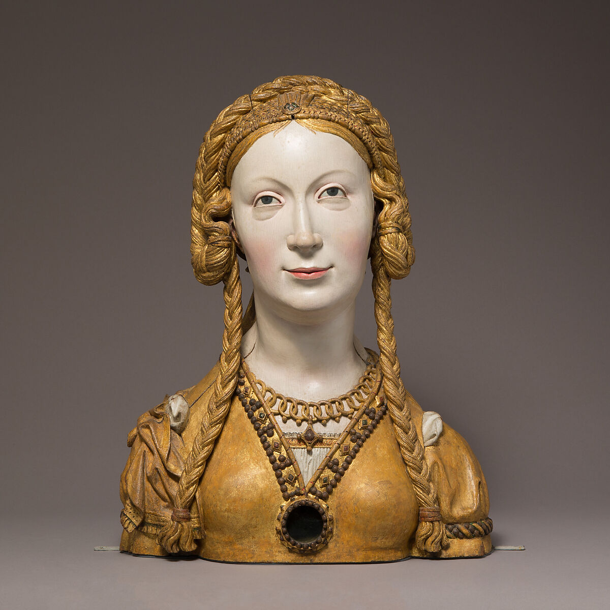 Bust reliquaries for the skulls of saints were placed on or near altars and, by the late Middle Ages, often assembled in large numbers in church sanctuaries. The small glazed medallion resembling jewelry once displayed additional relics. On particular feast days, such reliquaries were carried in processions.