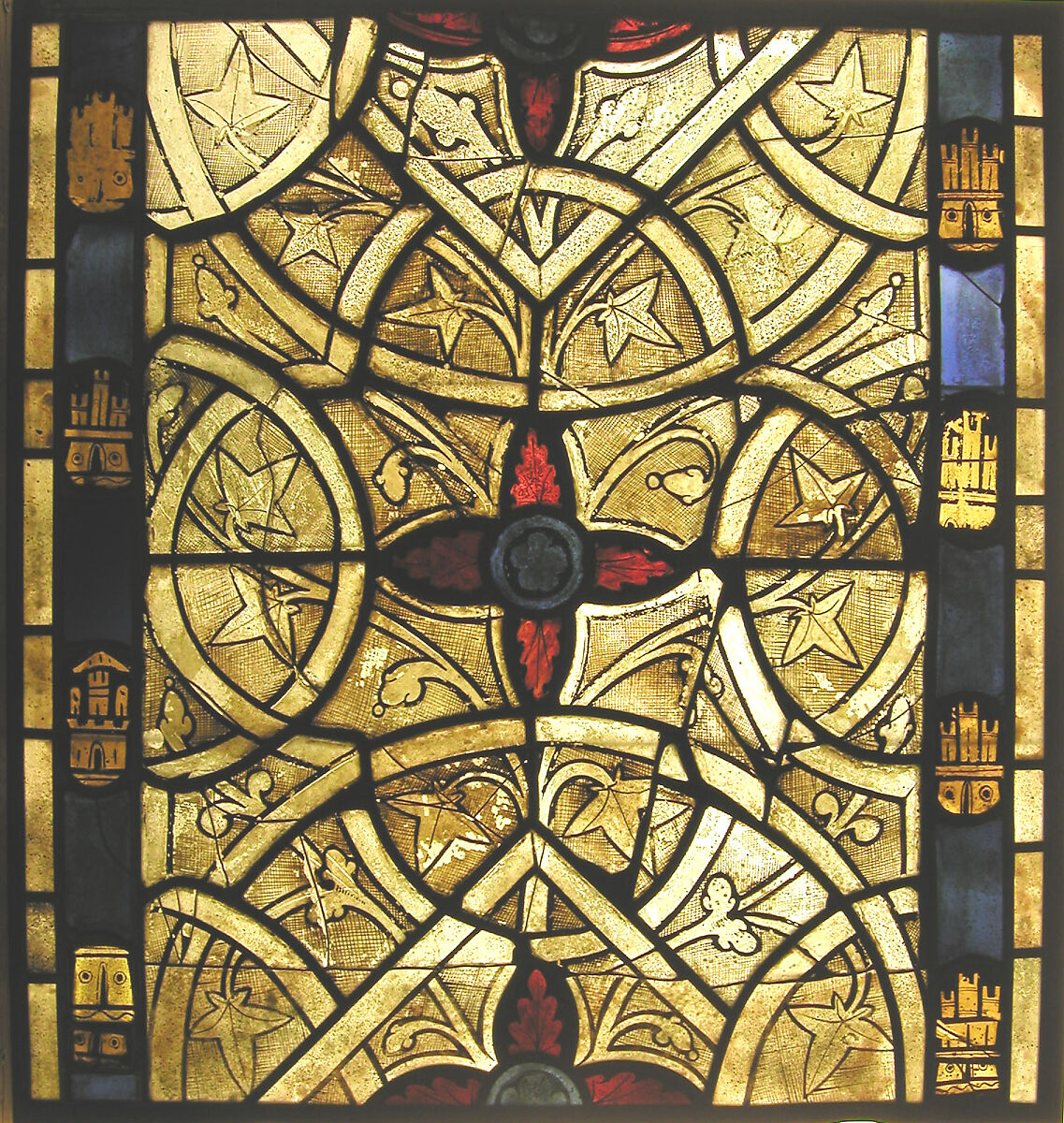These grisaille panels are part of a set of eight from a window in one of three chapels at the Norman residence of the French monarchs. They represent a mid-century transitional stage in royal French ateliers. The conventionalized acanthus buds are a continuation of earlier tastes, while the ivy leaves, delineated with hair-thin veins, reflect the newer, naturalizing tendencies. The castles in the border are devices of the kingdom of Castile and indicate royal patronage, probably that of Louis IX (1226-1272), who claimed the right to the Spanish throne through his mother, Blanche of Castile.