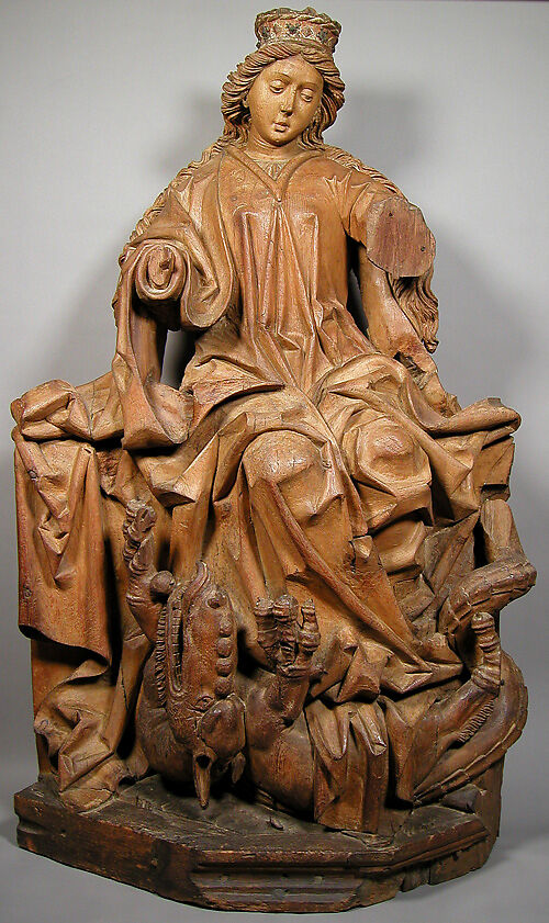 According to legend, St. Margaret was imprisoned for refusing to marry the governor of Antioch. Satan appeared to her in the form of a dragon and swallowed her as she clutched a cross in prayer; she then ripped open his belly with the cross and emerged unscathed. The statue may have held a cross in one of her now-missing hands; the vanquished dragon lies at her feet. This massive figure probably came from the central shrine of a large polychromed altarpiece.