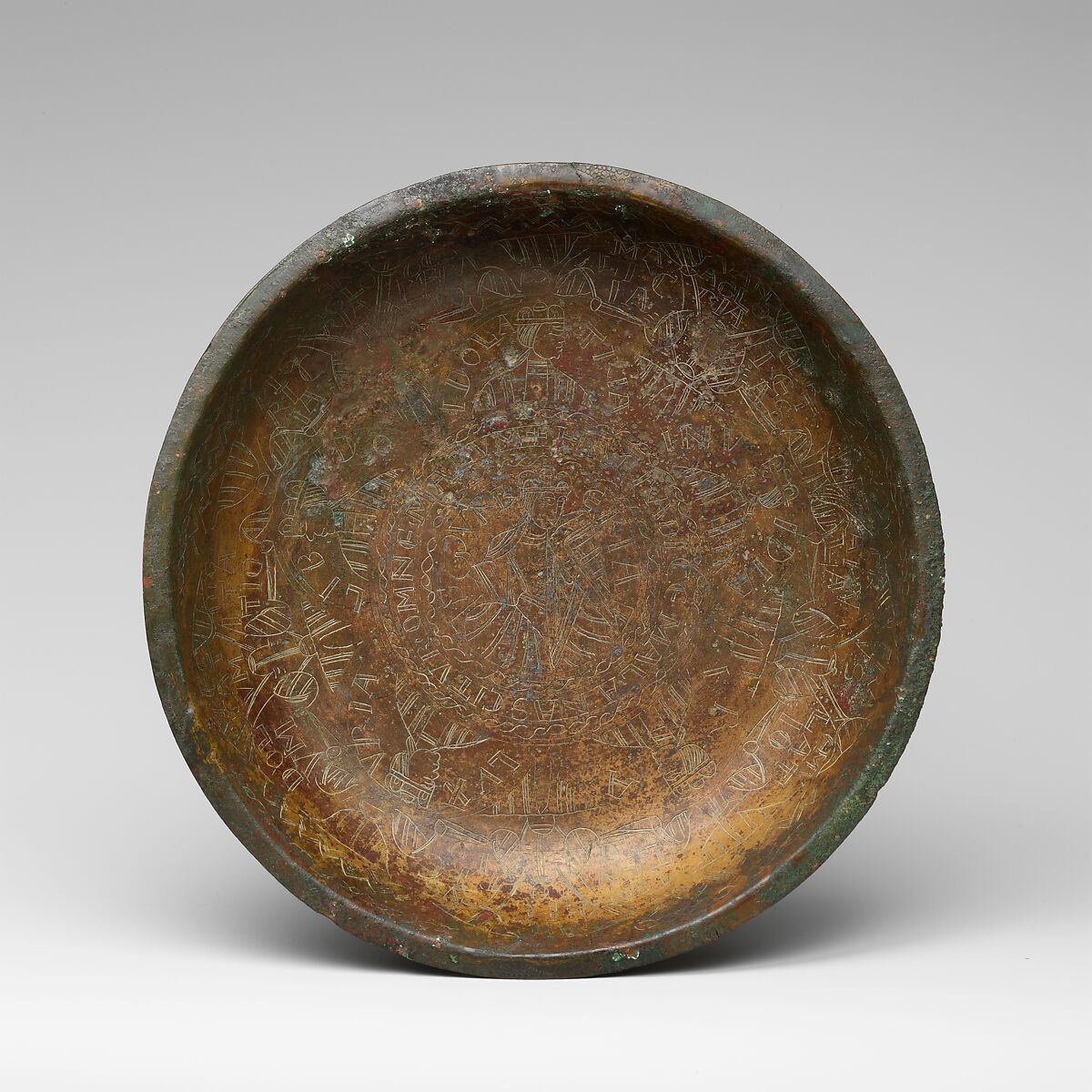 This shallow bowl, engraved with the personification of Pride in the central medallion, was used for hand washing. The central figure is surrounded by other vices, such as Jealousy, identified by Latin inscriptions, indicating the moralizing nature of the decoration. Such bowls were often produced in pairs, and this one would likely have been paired with a bowl depicting personifications of virtue. It belongs to a large group of surviving bowls, known as Hansa bowls, made in northern and western Germany, Scandinavia, and England during the twelfth and thirteenth centuries.