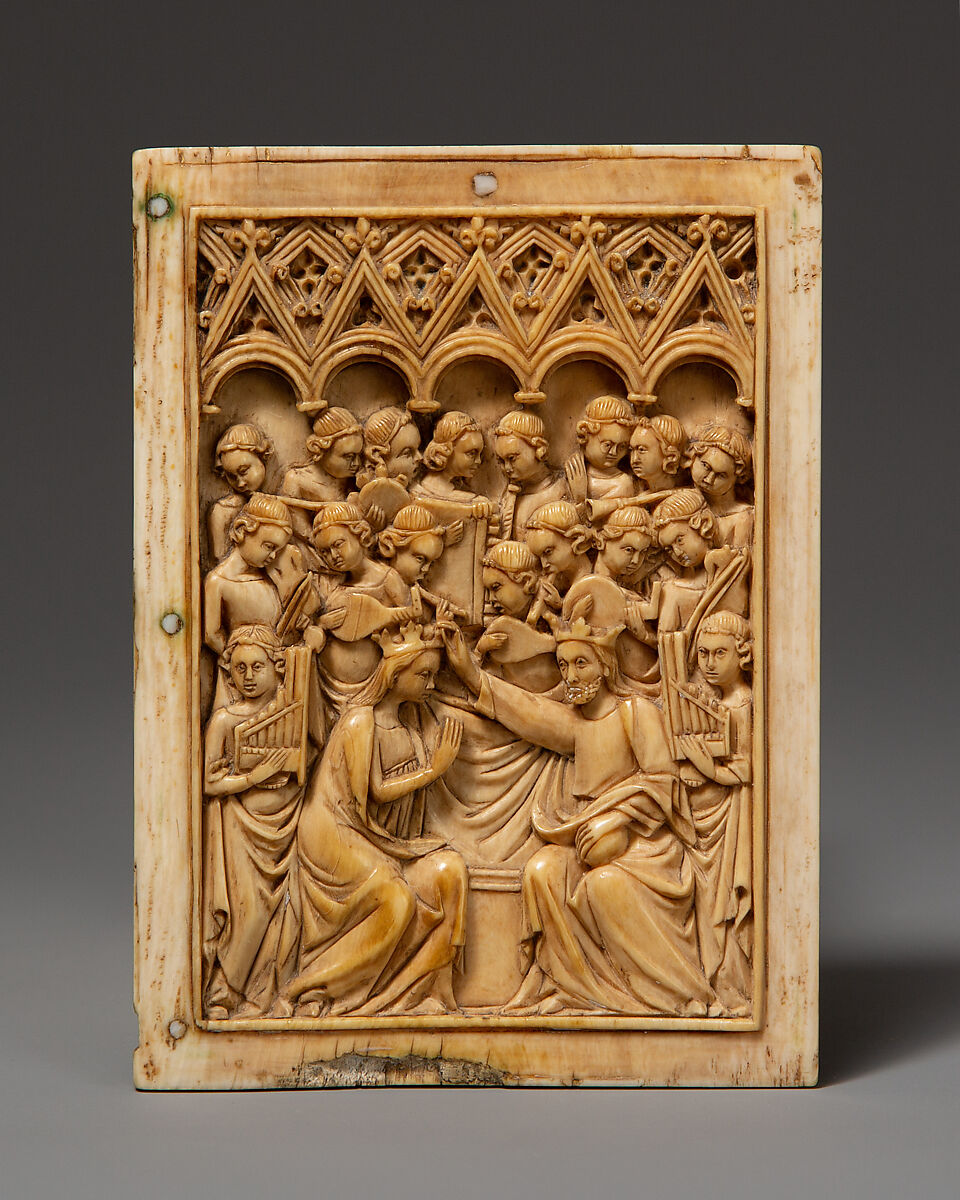 This panel from an ivory diptych depicts the Coronation of the Virgin with Mary and Christ surrounded by angelic musicians, representing the court of heaven. A related ivory diptych in the Victoria and Albert Museum, London, illustrates the Coronation and the Dormition of the Virgin.