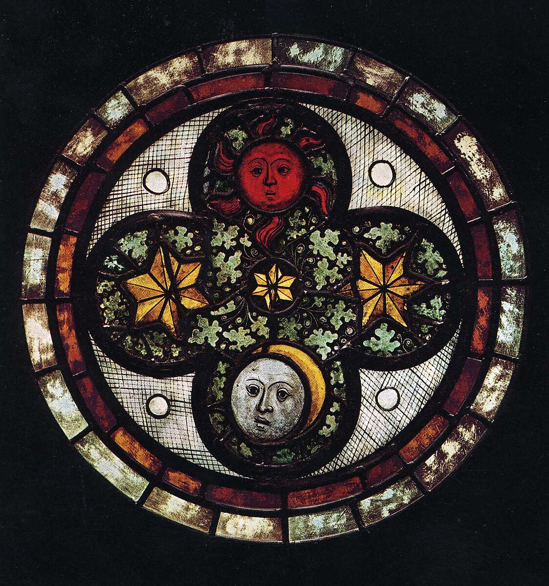 The castle at Ebreichsdorf, strategically positioned south of Vienna near the Hungarian border, served as a private residence for a member of the court. These windows from the glazing of the castle chapel were made by a large workshop in the employ of the royal dukes in Vienna. Elongated figures with heads often seen in profile, heavy masses of drapery, and an unusually rich range of colors distinguish the style of this court workshop. In contrast to the glass from Saint Leonhard in the central windows of this chapel, the figures here are placed in elaborate architectural settings composed of pinnacles and towers, imaginatively combined to create fanciful structures. These backgrounds link the individual scenes in a unified composition. Represented in this window are scenes from the infancy of Christ, including the Annunciation to the Virgin, the Presentation of Christ in the Temple, and the Adoration of the Magi with the Virgin Mary robed in royal purple but resting on a straw-filled mat. The tracery light above, representing the Sun and the Moon, is also from Ebreichsdorf.