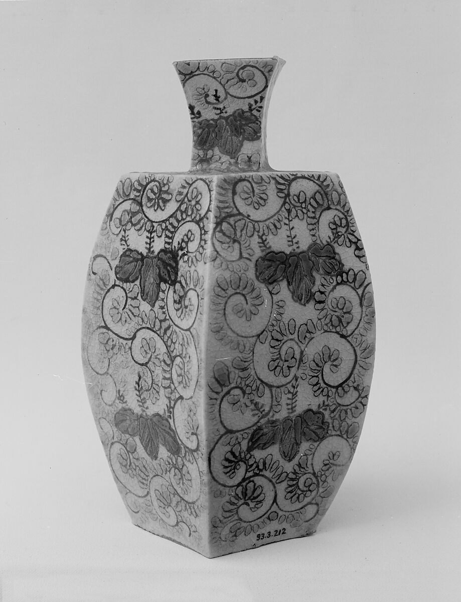 - Medium: Clay covered with a transparent crackled glaze, decorated with colored enamels and gold