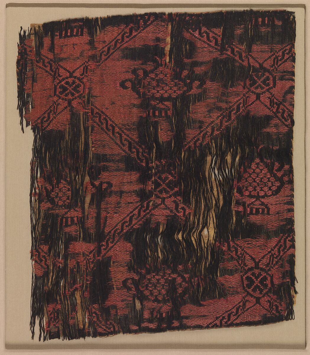 • Medium: Weft-faced compound twill (samit) in red, black, and blue silk