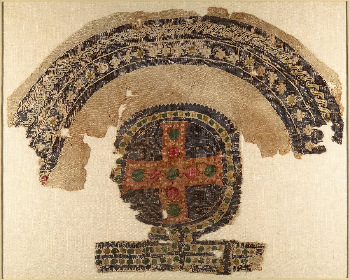 This vibrantly colored fragment of a hanging is a rare example of the survival of an Egyptian textile that may have been part of the furnishings of a Christian site. It is one of two similar fragments given to the Museum by Nanette B. Kelekian. Each is decorated with an arch enclosing an elaborately jeweled form of the Christian cross. No other works of the type are known to have survived. The pieces were probably once part of one large hanging embellished with a series of arches supported by columns.