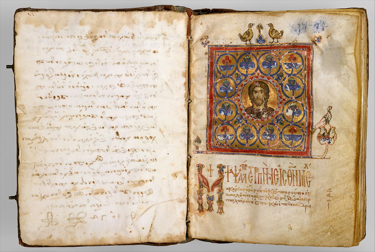 Literacy was highly prized in Byzantine state, with its sophisticated secular and clerical elite proving to be enthusiatic patrons of the book arts. This manuscript, one of the approximately fifty so-called aristocratic psalters that survive from the Middle Byzantine era, demonstrates the high quality of that period's book production. The text is elegantly written in gold letters on parchment, with vibrantly colored illuminations set against gilded grounds at selected readings. The iconlike illiminations assist in making the Old Testament text relevant for Christian use. Thus, God, to whom the Psalms are dedicated, is depicted as Christ Pantokrator at the center of elaborate headpiece over the introductory text (illustrated above). The illuminator has painted the face of Christ, the "world ruler" (pantokrator), in the finest Byzantine tradition, layering flesh tones and facial details over a green base color meant to represent shadows. The pairs of birds over the headpiece and in the ornate incipit letter of the text extend the Christian reference by evoking the dual nature of Christ--equally man and god.