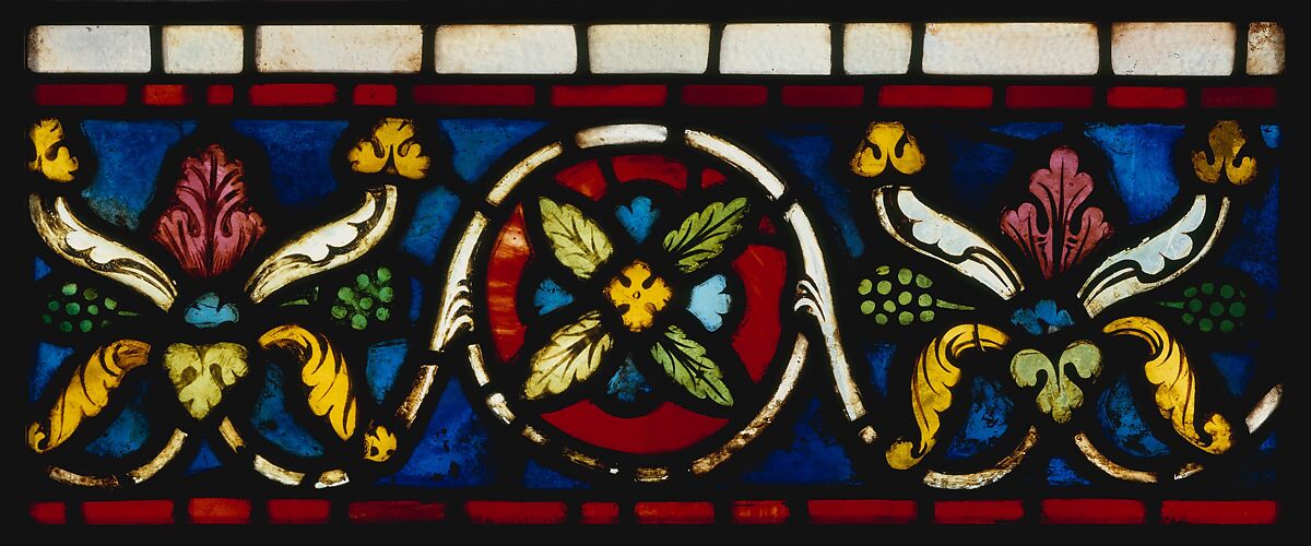 This fragment was originally part of the border of a stained-glass window, most likely from the clerestory of a church. It is composed of two different motifs-a palmette and a circle enclosing a rosette, a not uncommon combination in the 12th century, but increasingly rare in the 13th. The variety of color in this border, its lush vegetal forms, and the detail of painting relate it to stained-glass ornament produced around the end of the 12th century.
