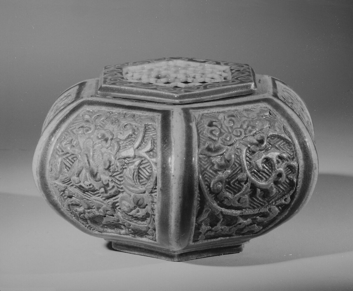 - Medium: Openwork cover; panels covered with enamels and containing decorations in relief, in colored enamels (Awata ware)