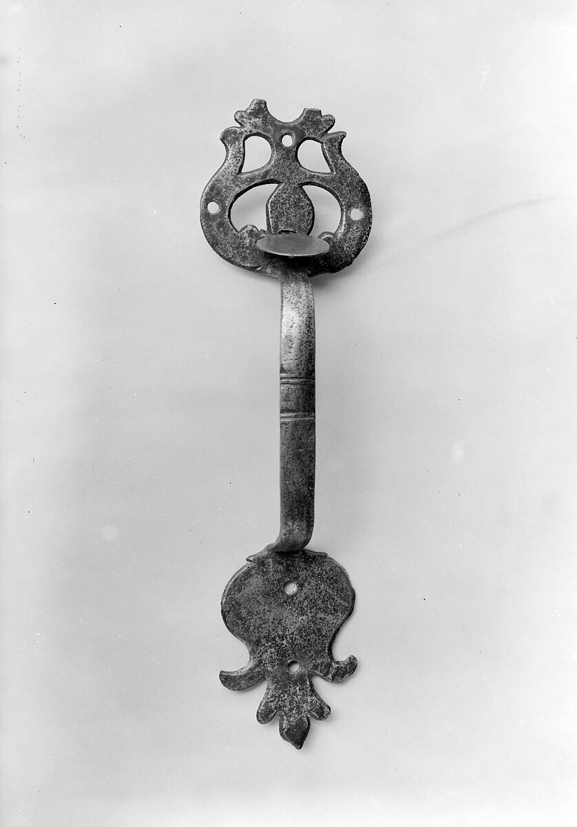 Early latches are differentiated by their cusps and grasps, whose most popular forms fall into two categories, known as the Suffolk and Norfolk types. The Suffolk latch has an upper and lower cusp joined by a handle. When the lower cusp was omitted by using the end of the grasp as a nail, driving it into the door, it was called a single cusp. Most often the Suffolk latch has matching inverted cusps, but occasionally elaborate decoration distinguishes the upper plate. The Norfolk latch has the grasp welded to the back plate, or escutcheon. This latch often had the grasp held by a pin at the top and free at the bottom—a swivel-lift knocker grasp. The Norfolk type was the most popular form of wrought latch but was outmoded when a cast door latch was patented in 1840 and manufactured in quantity. The present piece, made sometime during the eighteenth century, is an example of the Suffolk type with a dominant, pierced upper cusp and a simpler, tulip-shaped lower cusp.