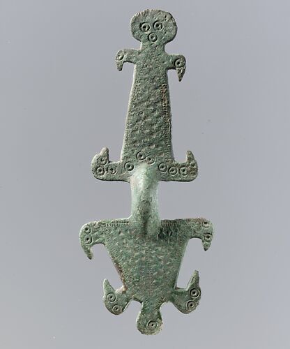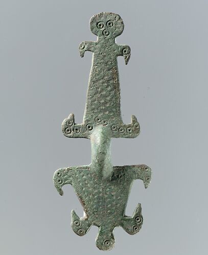 This brooch is one of the largest, most complex objects of its type to survive from late Bronze Age Europe. The five dynamic spirals were composed of three long wires. Hanging from the horizontal section are six composite elements: at the top of each is a bird surmounting a horse bit, beneath which are rings and pairs of dagger blades. The numerous hoards containing such objects suggest that they functioned as ritual offerings deposited during burials.
