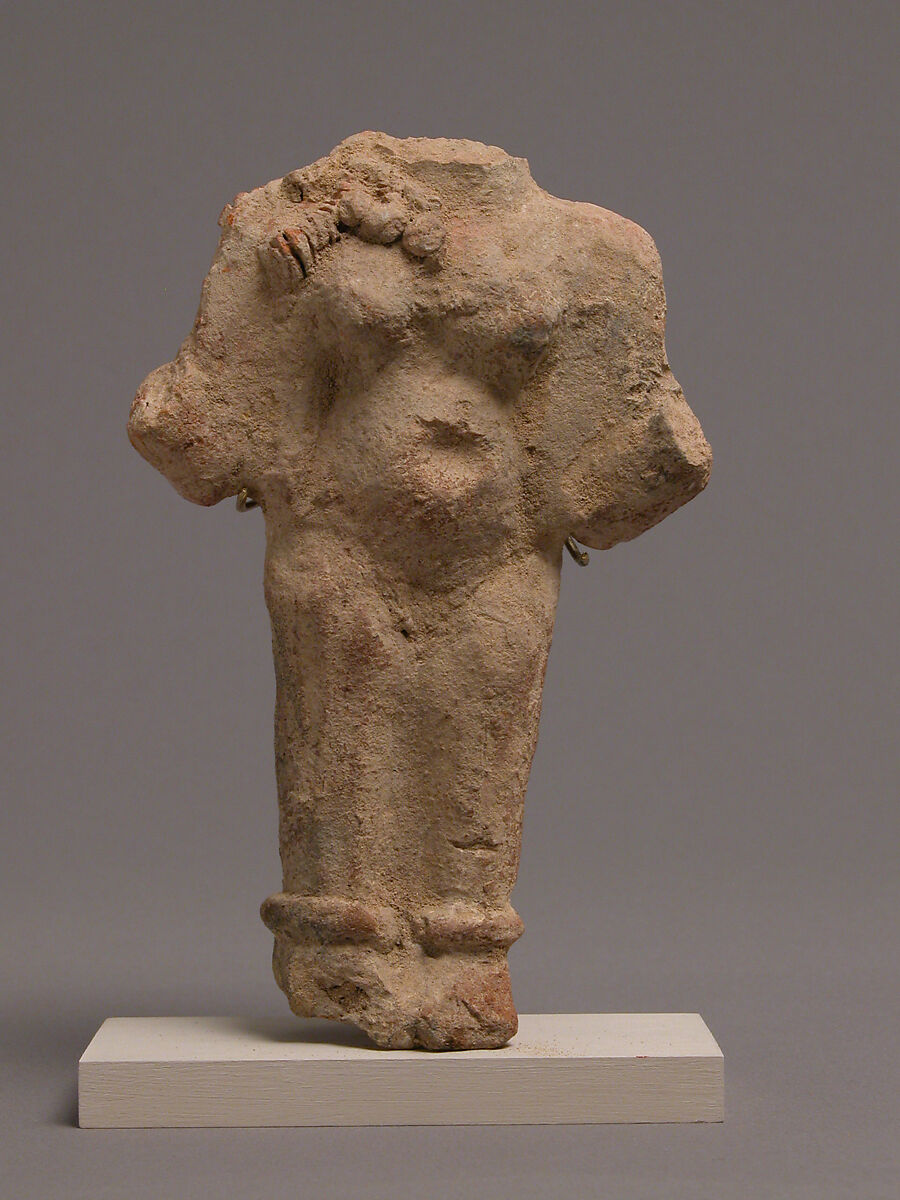This hand-molded object was found in Christian homes, but works like this continue a long history of Egyptian fertility figures. Decorated wall niches, thought to be domestic shrines, were found in the houses of the site. This figurine might have been used in one as a votive offering. For unknown reasons, it appears to have been deliberately destroyed.