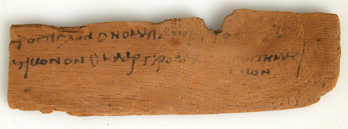 Pottery fragments with ink inscriptions are called Ostraka. Written in Greek, ostraka represent a Hellenized and elite Christian community in Kharga. This wooden tablet contains a Homeric reference from the Iliad on one side: The tutor of Achilles, Phoinix, and a Trojan archer, Pandaros, are both mentioned. Although the line is fragmentary, these characters are in books 9 and 4 of the Iliad, respectively. A school text on the other side, which suggests that the tablet was used to practice and teach Greek grammar.
