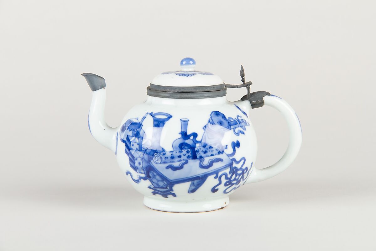 - Medium: Porcelain painted in underglaze cobalt blue (Jingdezhen ware), metal mounts