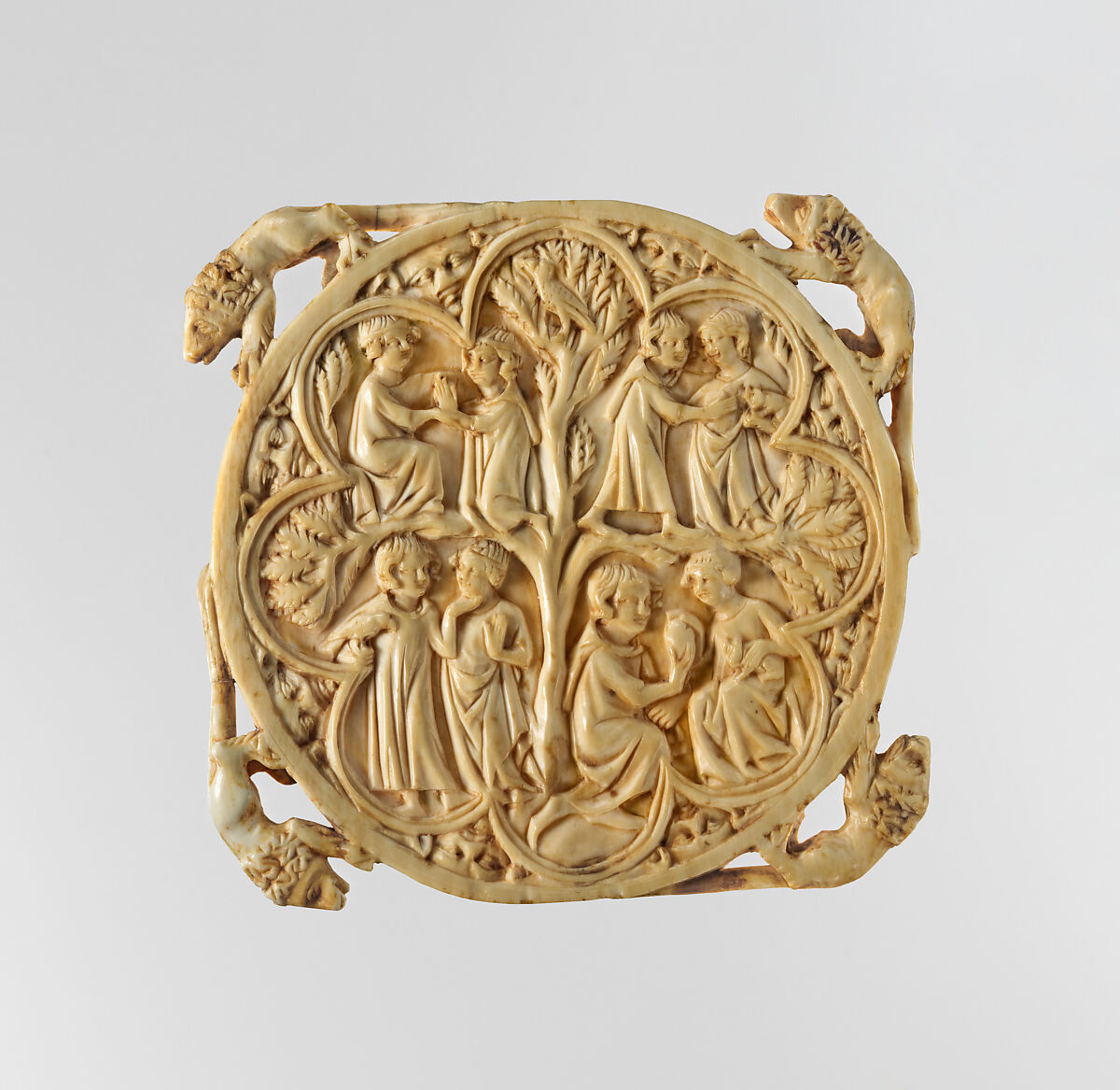 This plaque of ivory served as half the protective cover for a convex mirror of silvered glass that was once cemented to the lathe-turned recess on its interior. When first made, the interior’s grooved rim formed one half of a bayonet mount which allowed it to lock into another side to form a complete protective case for the mirror. The carved exterior of the mirror depicts four scenes of courting couples separated by the branches of a tree. The eight cusps that surround the scenes are inhabited by foliate heads. The rim of the mirror depicts four prowling, equidistant lions, lending the whole object a square silhouette. For its size, the delicacy of the carving, and its excellent preservation, this mirror-back is among the most outstanding survivals of fourteenth-century Parisian ivory carving.