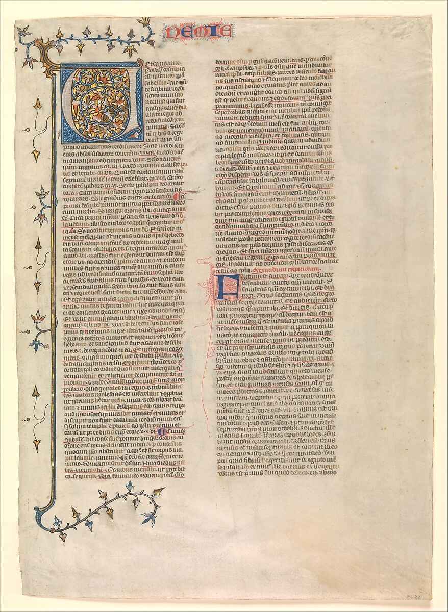 - Title: Initial "V" from the commentary of Nehemiah, one of six illustrated leaves from the Postilla Litteralis (Literal Commentary) of Nicholas of Lyra