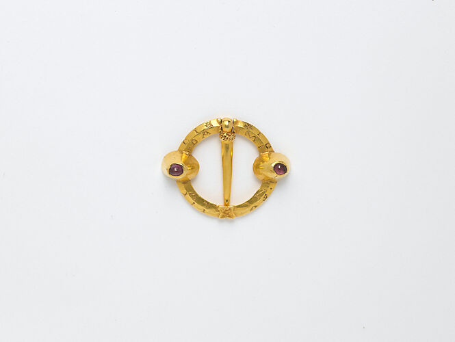 Brooches such as this were among the objects most frequently produced by goldsmiths. Simple and repetitive in design, the quality of these forms of adornment could vary widely. This is an example of a more finely wrought gold brooch. In addition to its comparatively lively, vegetal design, it is also embellished with semiprecious stones rather than glass paste.