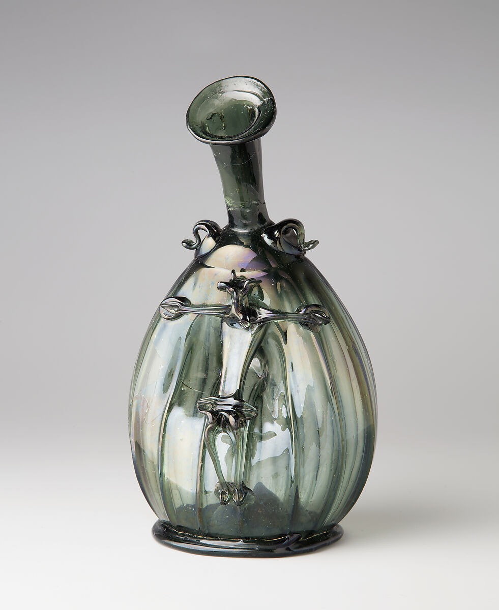 This vessel resembles a pilgrim’s bottle, with loops on its shoulders for attachment to a cord or strap. Exceptionally, however, a hollow, free-blown image of Jesus crucified (Corpus Christi) is attached to the flask. His body could thus be filled with wine or any other liquid poured into the bottle. The function of this unusual glass is not known. Could it have been used in church celebrations of the Feast of Corpus Christi?