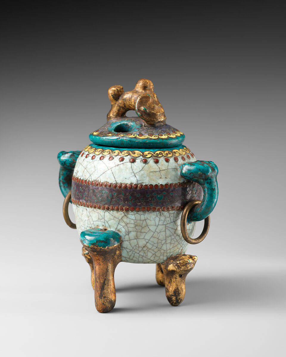 - Medium:Pottery covered with crackled glaze, enriched with cloisonné; bronze rings at sides (Kyoto ware)