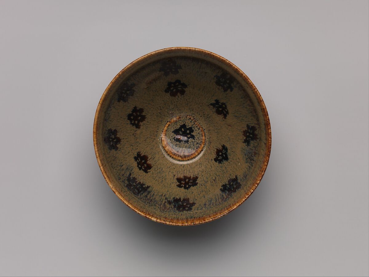 Noted for its imaginative designs and innovative techniques, Jizhou ware was produced at kilns in Jiangxi Province in southern China. Here, paper-cut plum blossoms were placed on an initial layer of black glaze and covered with brown glaze. The paper cuts were destroyed during the firing, leaving the design of plum blossoms on the inside of the bowl.