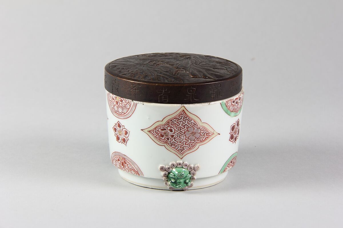 - Medium: Porcelain painted in overglaze polychrome enamels (Jingdezhen ware), wooden cover