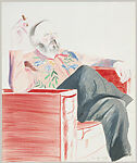 While his paintings are often large in size and brightly colored, his drawings, which are executed as independent works of art, are on a much more intimate scale and show his subtle mastery of draftsmanship and portraiture. This work is one of several he did of his friend and mentor Henry Geldzahler (1935–1994), a great proponent of contemporary art and curator of modern art at The Met from 1967 to 1977. Executed on paper with colored crayon, the drawing has the look of a spontaneous caricature, but aptly captures the sitter's likeness and character. Geldzahler's portly physique fits snuggly inside the cube-like chair. His relaxed pose (cigar in hand) and casual outfit (wearing one of his many print shirts) convey an ease and familiarity that are as much a result of his personality as they are of his friendship with the artist. Hockney's autobiographical references in his choice of subject matter make his art a personal diary of where he's been and who he's seen.