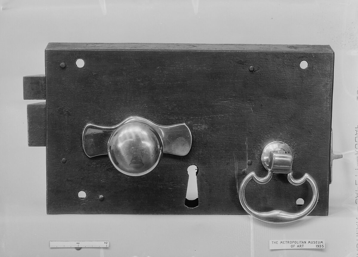 This lock comes from the front door of "Vaucluse," a house in Portsmouth, Rhode Island, built about 1800. The door was formerly in the American Wing collection but has been deaccessioned. The present lock may antedate the door it was on, as it seems to be in a 1760–80 style. However, because the door with which the lock was used is known to have been built around 1800, it remains dated to that period until more conclusive evidence regarding its date can be found.