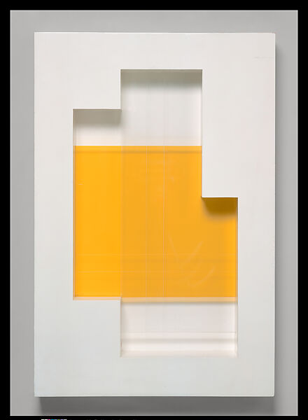 In the early years of his career as a painter, Charles Biederman studied Cézanne, Post-Impressionism, and Cubism before finally turning to total abstraction. His time in New York (1934–40) and his first trip to Paris in 1936 definitively shaped his art as he came into contact with the work of many European modernists, including Arp, Brancusi, Léger, Miró, and Mondrian, Pevsner, and Vantongerloo. He was particularly interested in Constructivism (with its use of industrial materials) and De Stijl (with its rigid geometry and primary color schemes), two art movements that produced geometric, nonobjective images. By 1937, Biederman's work was becoming more sculptural, and subsequent pieces, such as New York, Number 18 of 1938, were rendered as shallow, painted reliefs. These wall-hung panels—often incorporating wood and plastic materials—could be seen from various angles, and natural light and cast shadows enhanced the visual effect. Here, the central portion of the rectangular box has a recessed center, cut out to form a number of right angles; translucent plastic sheets set into the hollow add a shock of yellow to the otherwise white scheme.