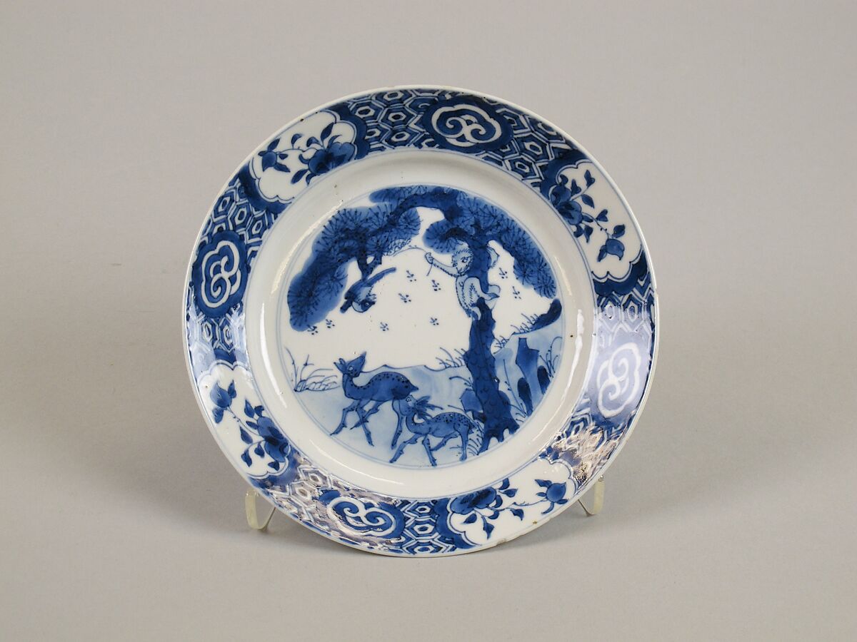 Visual puns, often made by using homophones, are a popular design language in Chinese art. In addition to being a zodiac animal, the monkey also symbolizes a noble title, because it is pronounced the same as the word for marquis (hou) in Chinese. Here, monkey, bees, magpie, and deer are combined to convey “giving great wealth and bestowing a noble title” (jue lu feng hou). This handsomely painted blue-and-white dish therefore expresses two wishes for good fortune.