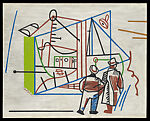 Heralded for his abstract visual evocations of jazz, Davis also responded profoundly to the industrial age in his art. The present work features two men standing before a schematically rendered structure with their backs to the viewer. Likely representing a construction site with the foreman and investor looking on, the painting alludes to New York’s interwar construction boom. Highlighting the degree to which industrialism was associated with masculinity, Davis’s painting, consisting of primary colors on a white ground, also testifies to the artist’s respect for Piet Mondrian.