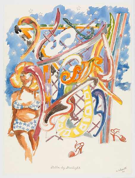 This small watercolor relates to that 1970s series. In it, a blonde woman in a star print bikini, with her red heels casually tossed to the side, confidently poses in front of a colored metal relief by Frank Stella against a twilit sky. Colescott frequently represented such stereotypical all-American beauties in his oeuvre as a comment on cultural depictions of white women and mainstream standards of beauty. The work’s title, Stella by Starlight, invokes both a suite of sculptures that Stella made in the late 1970s and early 1980s and a jazz standard made popular in the mid-twentieth century by musicians including Miles Davis and Charlie Parker. It might also be a punning double reference to the shared name of the woman in the drawing and the artist whose work she stands before.