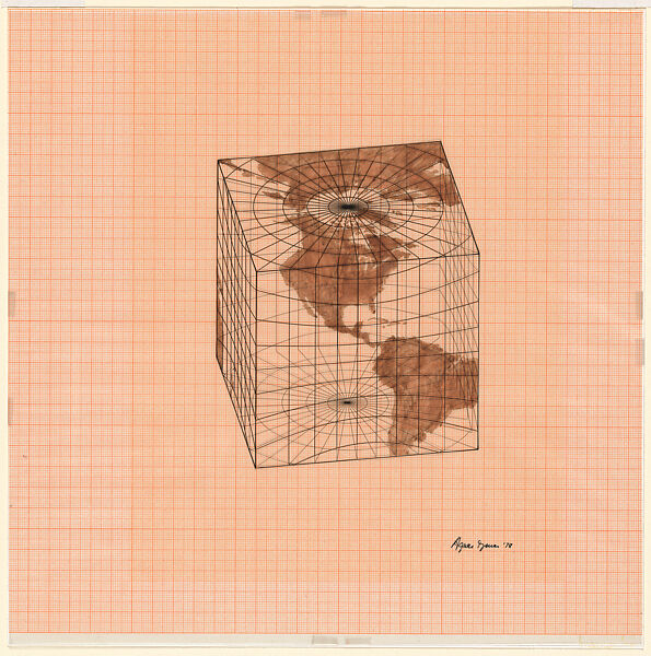 Born in Budapest, Hungary, Agnes Denes was educated in Sweden and the United States. She began her career as a painter, but has since expanded her activities to encompass a wide range of media, including drawing, printmaking, photography, site-specific sculpture, and environmental art. Although she does not fit neatly into any specific school, her philosophical approach and grid motifs align her with Conceptual Art and Minimalism. This intriguing drawing reflects her characteristic application of science to artistic expression and her concern for aesthetic presentation. While the viewer may not fully comprehend the intellectual content of her image, he or she can appreciate its beautiful execution and unusual analysis of form and space. Study of Distortions: Isometric Systems in Isotropic Space is typical of the topographical motifs Denes had been producing since the late 1960s. Here, she offers an alternate perception of space and time by projecting a section of the globe onto a cubic framework. The drawing is actually made up of two pieces—a sheet of graph paper underneath on which a map is painted with watercolor, and a clear plastic leaf on which a cube is precisely penned and gridded. As the artist states, she is "working with a paradox, defining the elusive, visualizing the invisible, communicating the incommunicable. . . " Such projects were never meant to be realized in three dimensions, but their visionary images spur us to think about the world in a new way and contemplate our place in it.