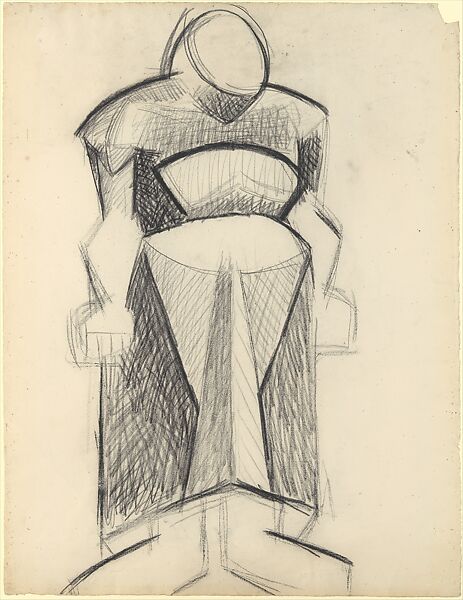 The model for this figure was fifty-eight-year-old Madame Putman (1850–1939), who, at more than six feet tall and nearly three hundred pounds, fascinated the diminutive Picasso. A widow and mother of seven, she was the artist's landlady in La Rue-des-Bois, a small village north of Paris where Picasso stayed from early August to early September 1908. This is one of seven drawings the artist made of the powerful woman as she went about her chores (she was too busy to pose) in preparation for two paintings.